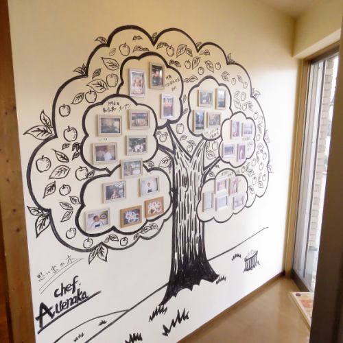 店内には、シェフ自ら描いた大きな木の絵に写真が飾られ、壁の向こうの厨房の雰囲気を描いた絵もあります。思わず眺めたくなるような温かみと楽しさがあふれる空間で、お食事の時間をより心地よいものに。訪れるだけでほっとできる雰囲気の中、こだわりのお食事を味わいながら、思い出に残るひとときをお過ごしください☆