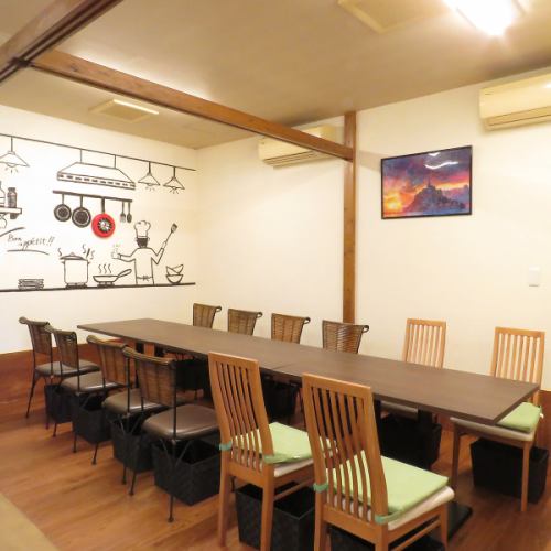 レストランアップルミントの店内は、親子で手作りしたDIY空間が広がります。壁には手書きイラストが飾られ、ほっこりとした温かみを感じられる空間です。4名様向けのテーブル席は、ママ会や女子会、家族での集まり、もちろん宴会にも対応可能◎明るい色合いと柔らかい照明が、ゆったりとしたくつろぎの時間を演出します。